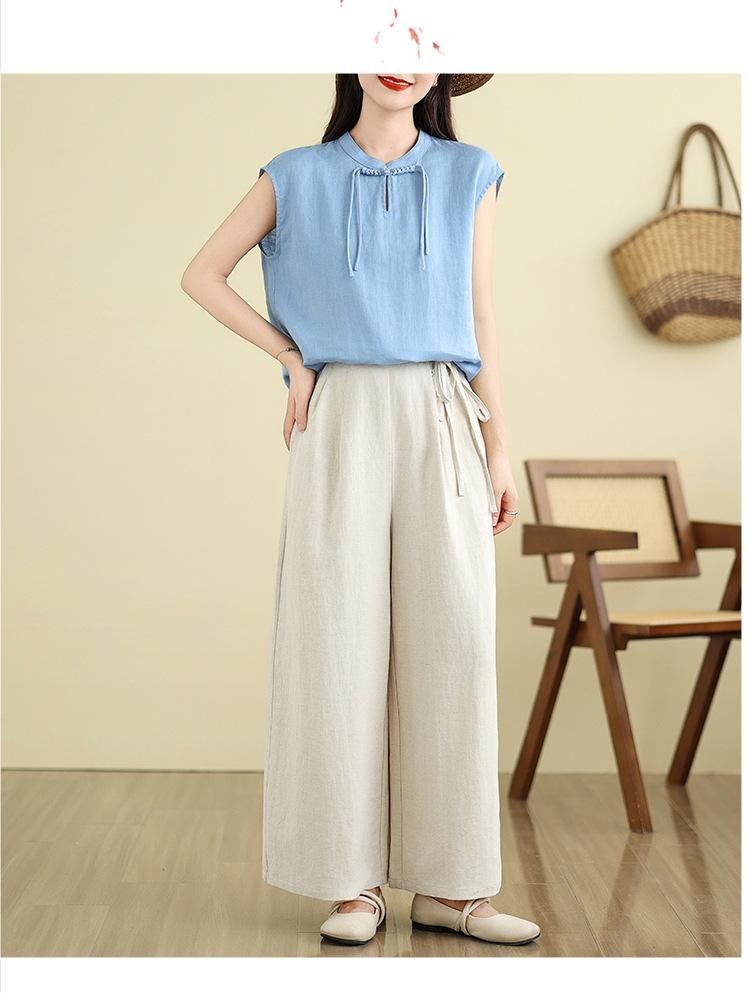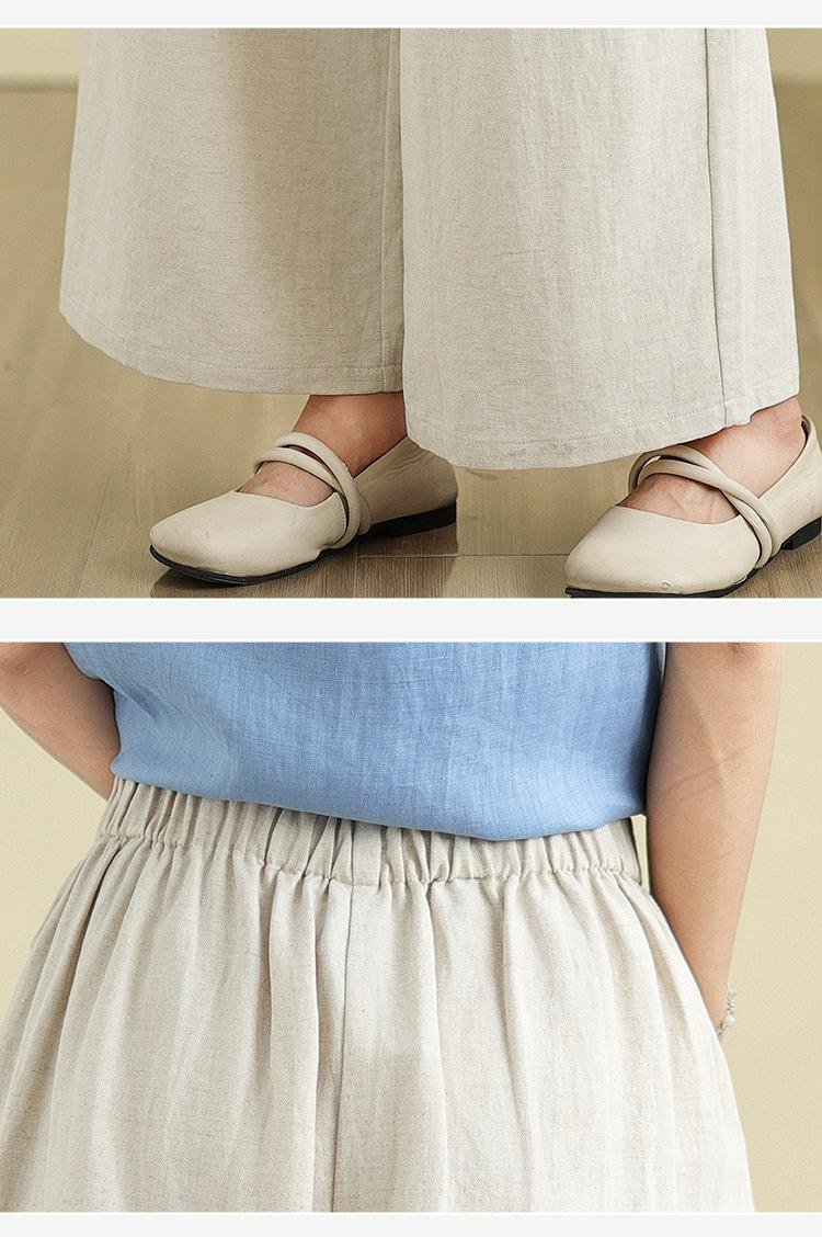 レディース夏用薄手綿麻ワイドストレートパンツ 九分丈 カジュアル